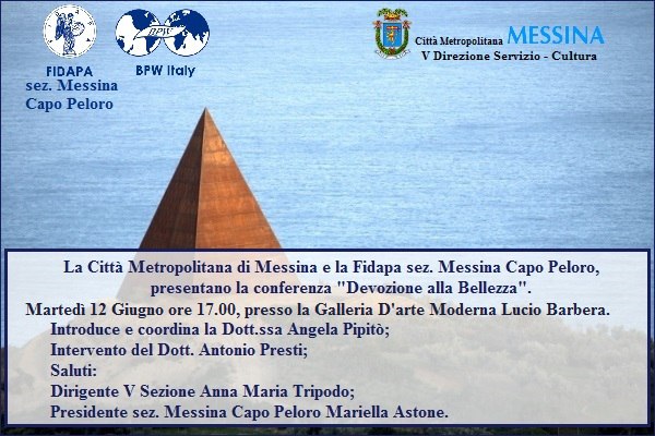 “Devozione alla Bellezza”, questo il titolo della conferenza che Antonio Presti terrà presso i locali della Galleria d’Arte Moderna e Contemporanea domani 12 giugno, alle ore 17,00. L’iniziativa è stata organizzata dalla V Direzione, Servizio Cultura della Città Metropolitana di Messina e dalla Fidapa, sezione Messina Capo Peloro. All’incontro parteciperanno gli studenti dell’Istituto “Jaci” impegnati nell’attività di “Alternanza Scuola-Lavoro” presso la stessa Galleria d’Arte “Lucio Barbera”.