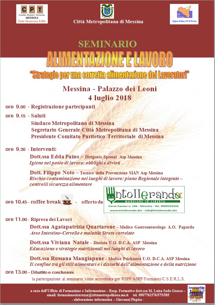 Si svolgerà mercoledì 4 luglio 2018, con inizio alle ore 9 presso il Salone degli Specchi di Palazzo dei Leoni, il Seminario “Alimentazione e lavoro: strategie per una corretta alimentazione del lavoratore” organizzato dalla Città Metropolitana di Messina con il patrocinio dell'Asp Azienda Ospedaliera di Messina e del CPT Comitato Paritetico Territoriale di Messina.