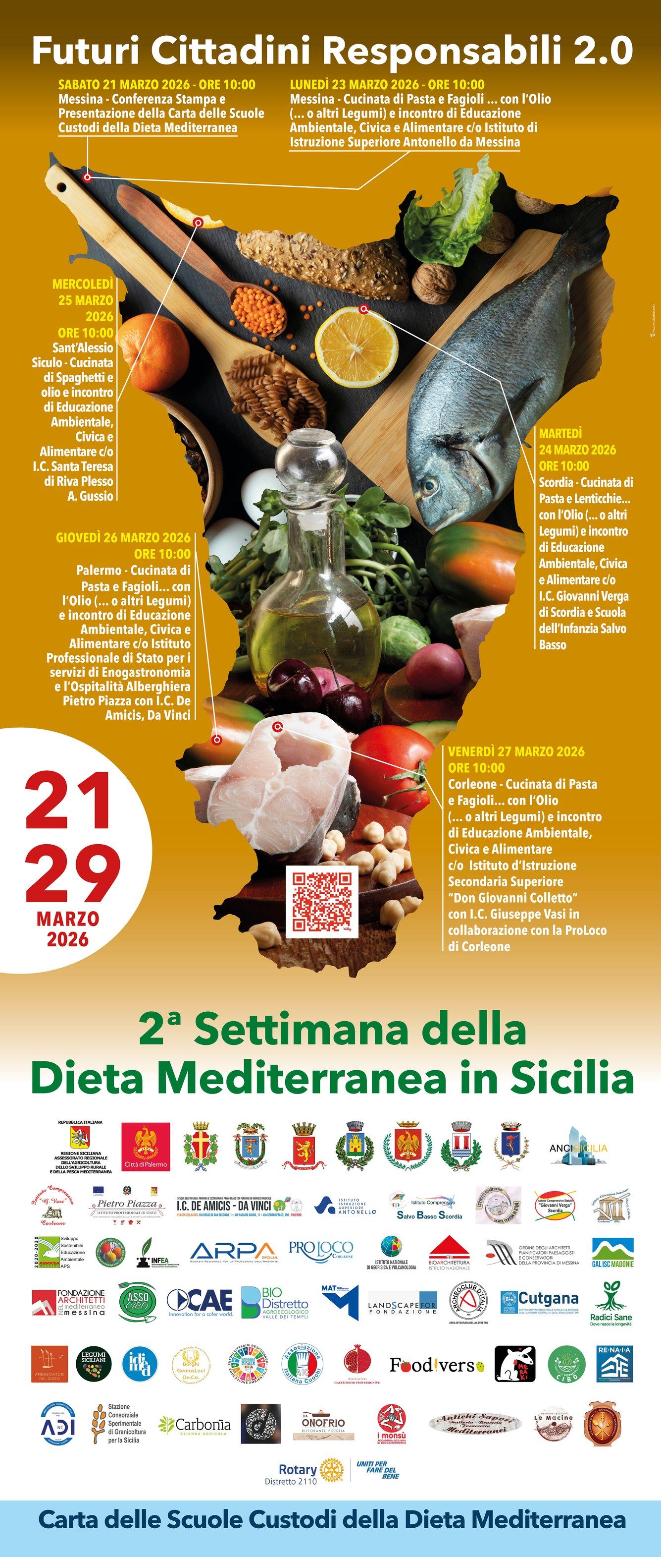 • Sabato 21 marzo 2026, ore 10:00: Presso la Sala Ovale del Comune di Messina, si terrà la Conferenza Stampa di Presentazione dell'iniziativa. Nel corso della mattinata avverrà la presentazione della "Carta delle Scuole Custodi della Dieta Mediterranea".